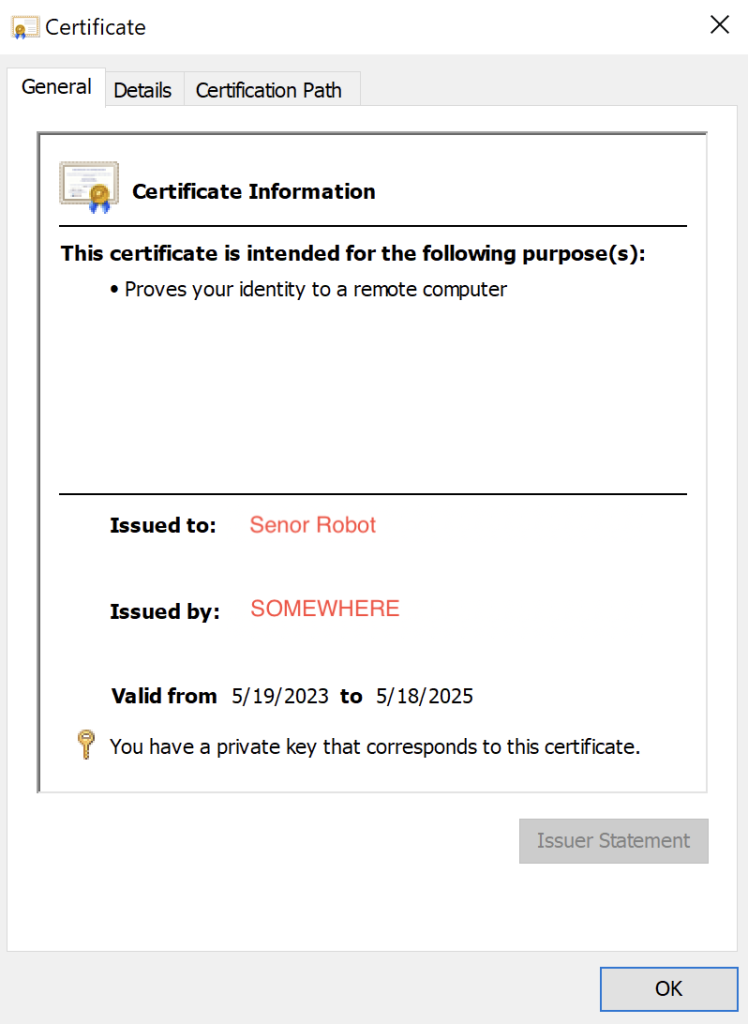 Let’s translate the prior paragraph into “computer terms”. Let’s assume Sr. Robot is now a computer, trying to connect to a network named “SOMEWHERE”, which requires a valid authentication for entry. In our example above, Sr. Robot’s Computer has been issued an Identity Certificate (passport) by the network (SOMEWHERE). When Sr. Robot’s Computer tries to access the network (travel), it will be able to present it’s issued Certificate (passport) to the network (SOMEWHERE) for validation (TSA agent). Hopefully that’s not too bad of a translation into a “techie” explanation…