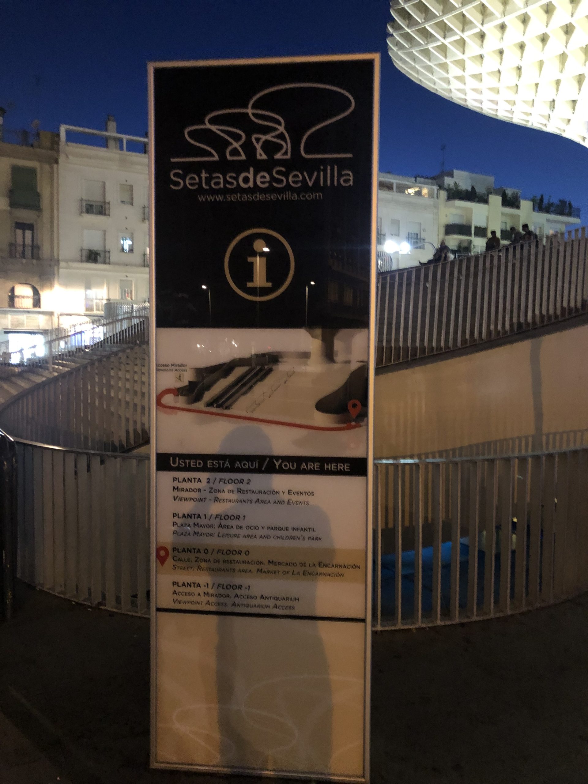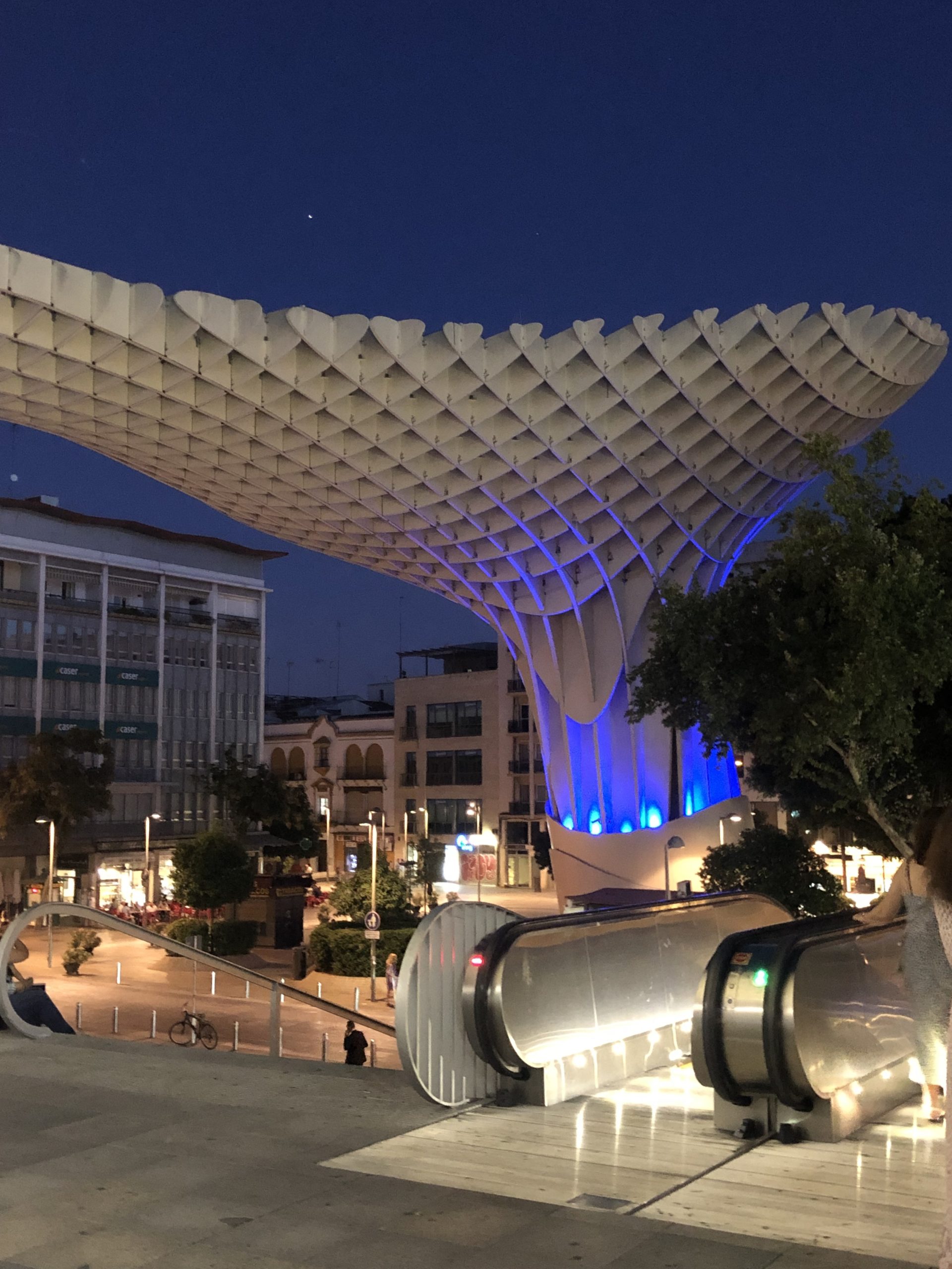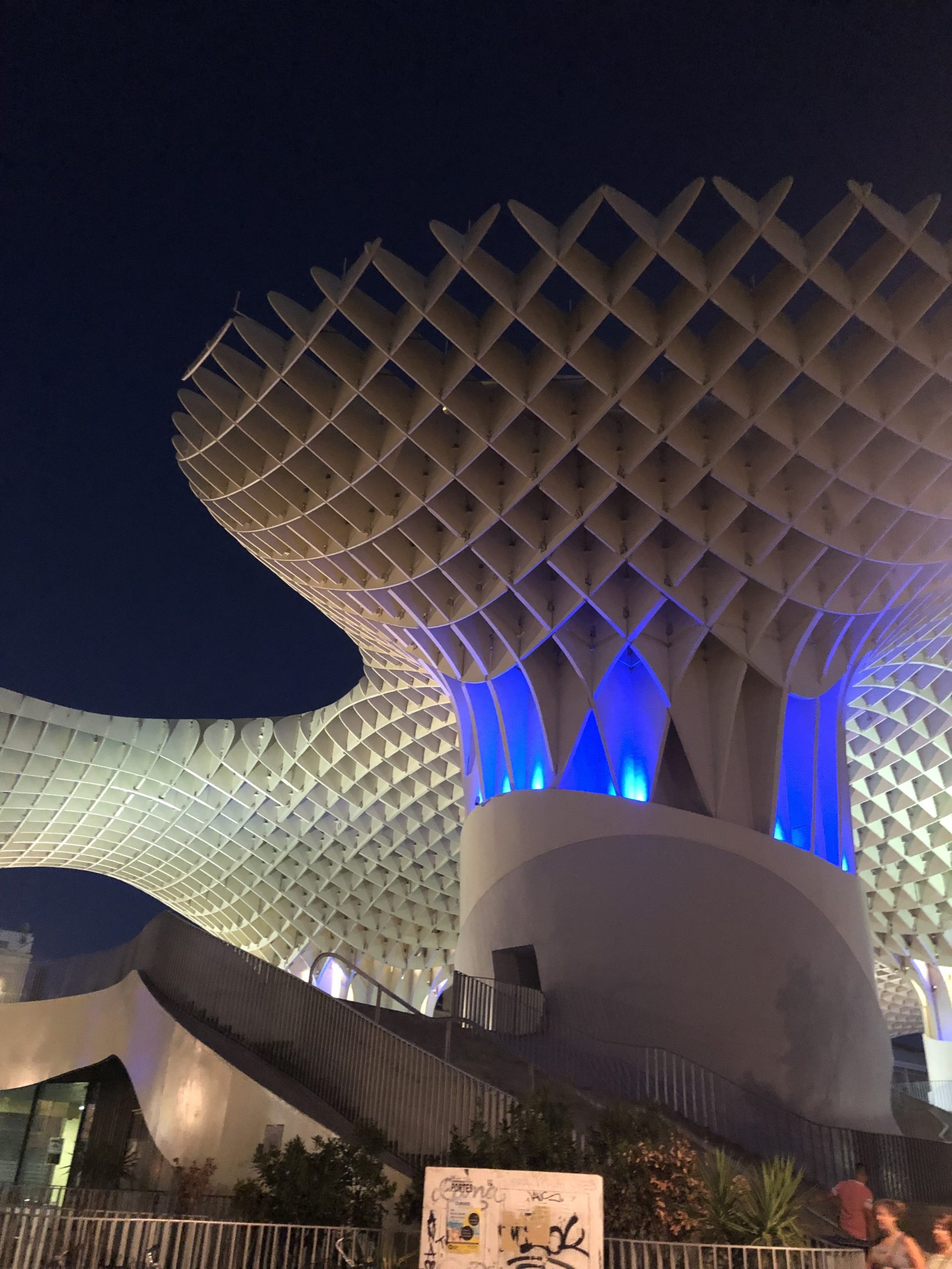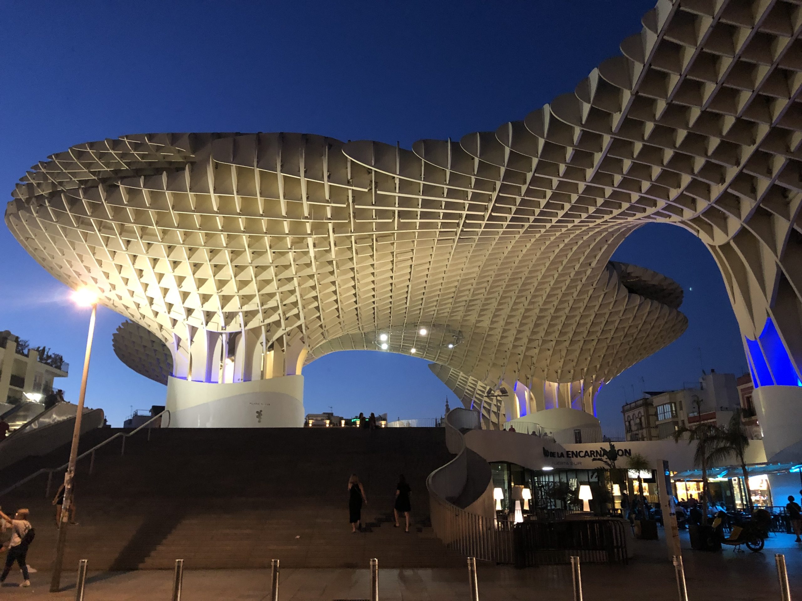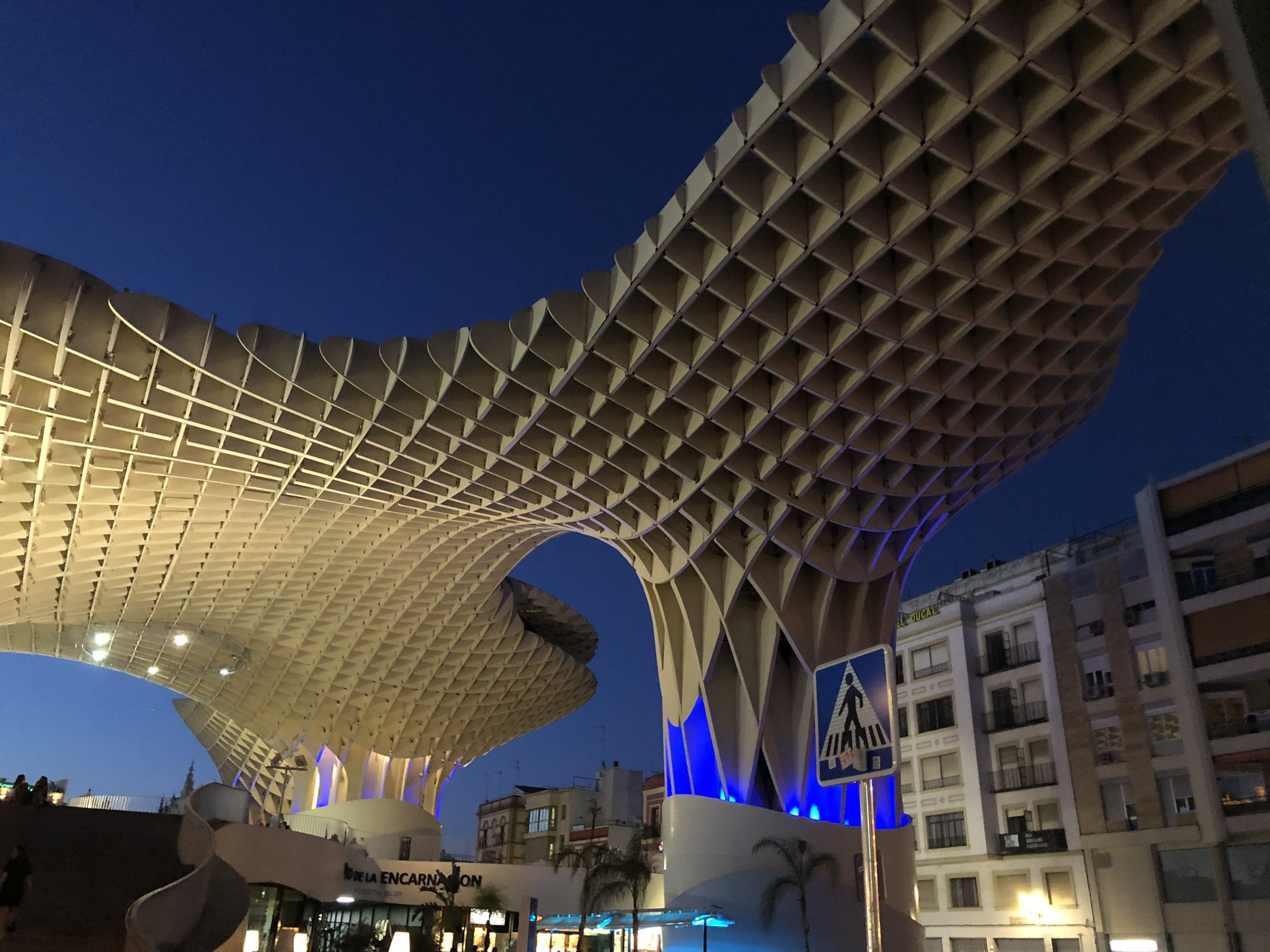 A little ways further north from the Parque de MarÃa Luisa, are the Setas de Sevilla. One of my bros had read about it and wanted to head over to see what interesting architecture had been put together. So we hopped in a taxi and headed north. It was a really cool design and had some interesting views of more urban areas. We chose the evening/tarde to go see it as we had heard there was some lighting designs that were pretty cool to see. We caught a glimpse of that, but the larger lights were still on when we had gotten there.